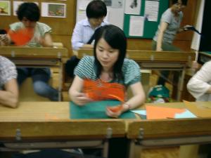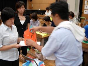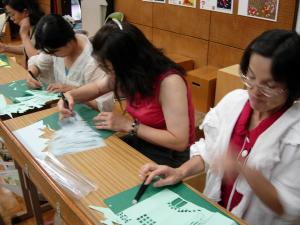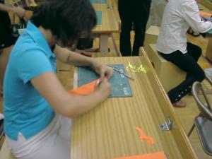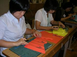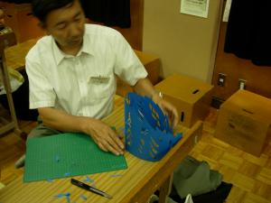 | 広げて、切る。 次の折り目のところで、少し工夫したくなる。 丸めて立たせてみる。 どこを切ったらいいか、自分なりに見通しが できる。 先生方も夢中です。 ポイントは、カッターナイフの角度を寝かせた まま引くために、「ヒジでひく」というイメージを 伝えること。 また、カッターナイフを一メモリ分折って、切れ味 をよくすることも重要です。 |