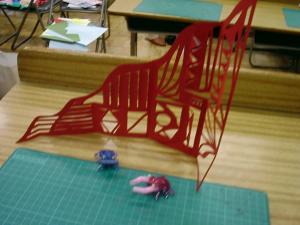 | 切り抜き、折り返しなど、どんどん思いつき ます。 教師の参考作品があると、イメージがわきや すいようです。 まねをして、そこから高めていくという道すじ がよいようです。 |
