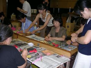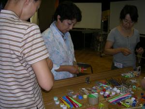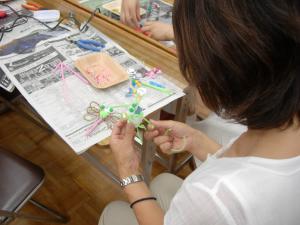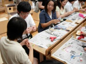 | 思いがけない材料の使い方をする方が続出。 それは、「知っている」のではなく、「思いついた こと」。誰かと一緒につくっていると、よけいによい 発想がわいてきます。 これが、「図工でつなぐハートとパワー」です。 |