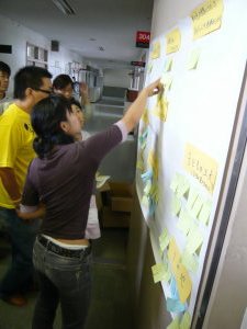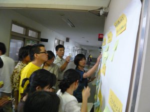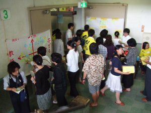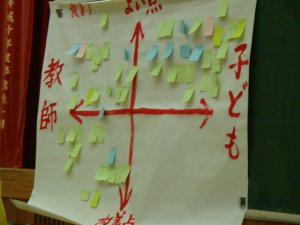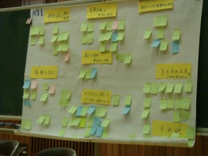 | こちらはKJ法的に授業の感想や意見を 付箋紙に書いて貼っていただいたものです。 授業会場である講堂の出入り口前に掲示 しました。 授業直後に、あるいは授業中にどんどん貼ら れる付箋紙の内容はどれもすばらしく、 分科会や全体会での話し合いにも生かされ ました。 |