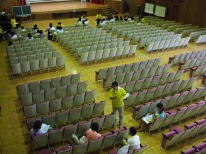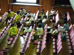 | 講堂前や後ろで、図工室で、音楽室で・・・ 2つの授業について感じたことを話し合い ました。 |
