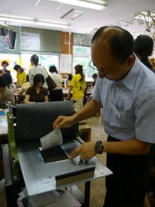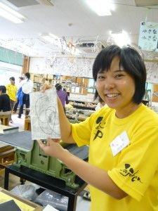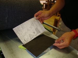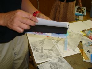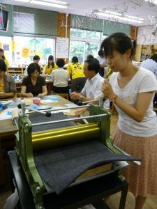 | めくるときが楽しみなのは、版画の特徴ですね そうそう、版画のプレス機(エッチングプレス ともいいます)を、自分の学校から運んで きました。重かったけど、みなさんに喜んで もらえて苦労も吹き飛びました。 |