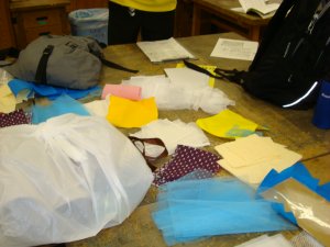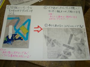 | ダンボール、エアキャップ、フェルト、レース、 布、網、毛糸、スポンジ、ガーゼ、タオル・・・ すてきな形に切って、ならべて、版画にします。 でも、インクやばれんなどは一切不要! カーボン紙で刷っていきます。 材料(左下) |