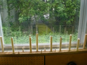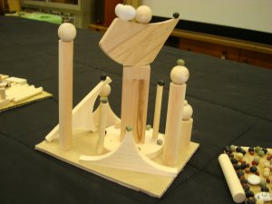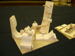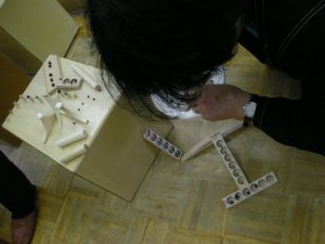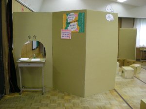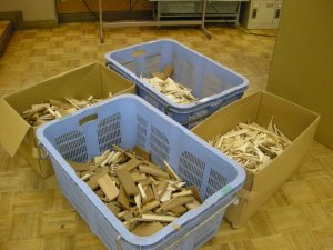 部屋をブースに区切り、他グループの活動が 見えないようにしてあります。 後で全体が見渡せるように、ダンボールの 仕切りを使用しました。 今回の活動に使う材料は、 木片(左下)と豆(右下)です。 さて、どうなるでしょう。 |