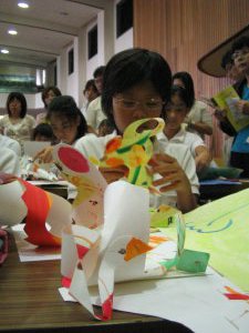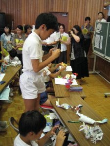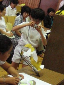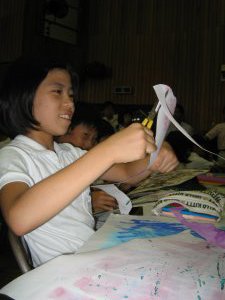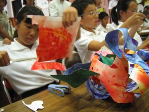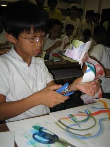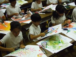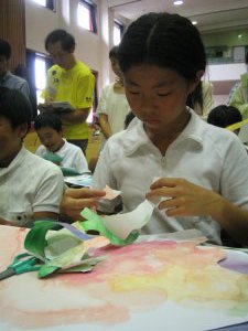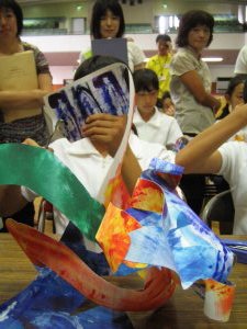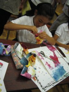 | 3時間扱いの3時間目 1・2時間目に、画用紙の両面にさまざまな ペインティングをして楽しみました。 本時は、ペインティングの模様のよさを生かし、 はさみで紙を切り抜き、立体的な絵として再構 成します。 |