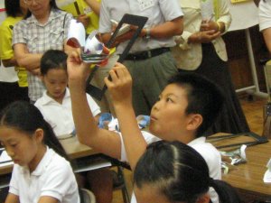 | ペア(となりどうし)の友だちと、作品のベスト ビューポイントをさがします。 感じ方は同じかな? 違うかな? デジカメや手作りフレームを使って作品を 見ると・・・ |