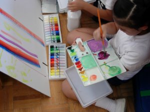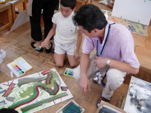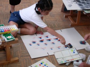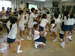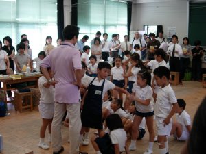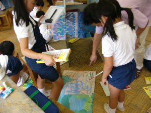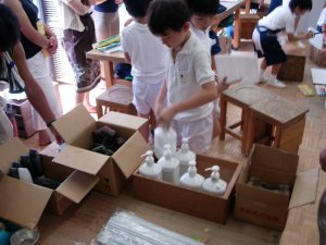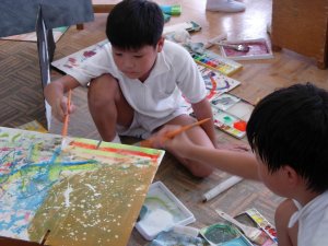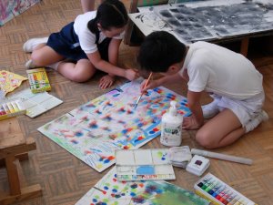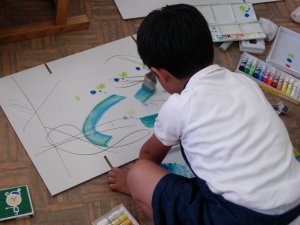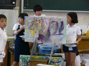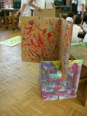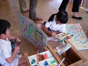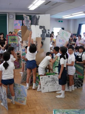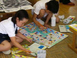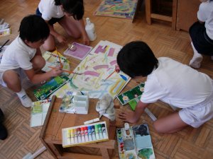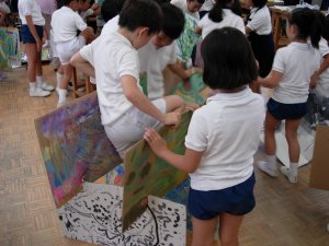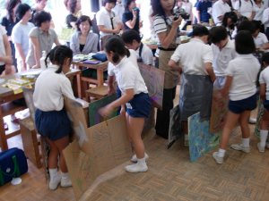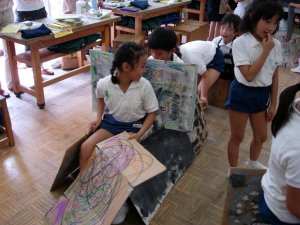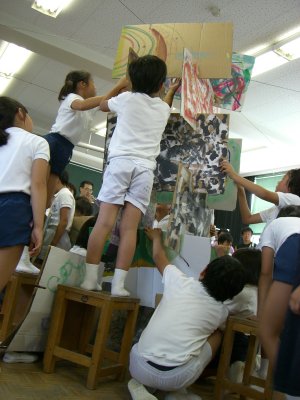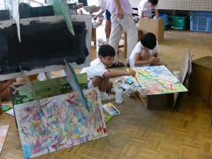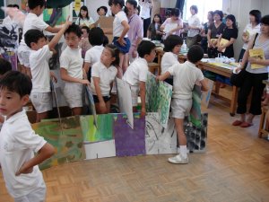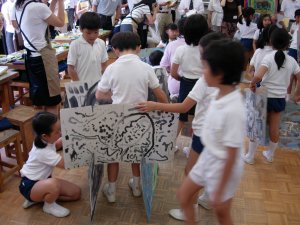 | 1学期に行った劇の再現をしています。 暗黒大王に色を奪われてしまった! 世界は白と黒だけの世界に!! みんなで色を取り戻しに行こう!!! そして、暗黒大王は倒れ、世界に色は戻った。 |