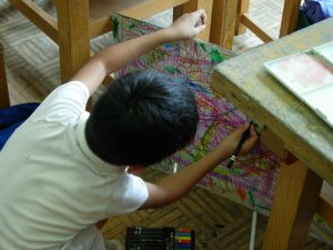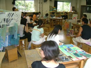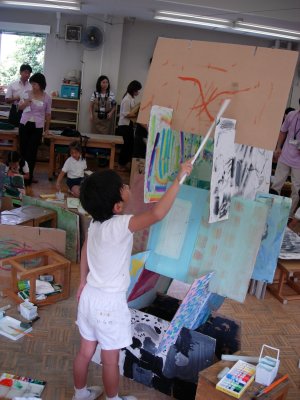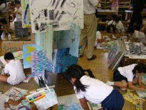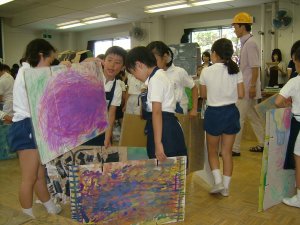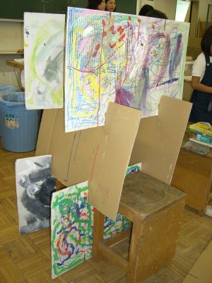 | おや、現場監督さんがいますね。 なにかの建設現場ですか? そう。前時までに描いた白黒の世界とカラフル な世界のボードを組み合わせています。 「建設中! いろイロ色けんきゅう所」 のはじまりです。 |
