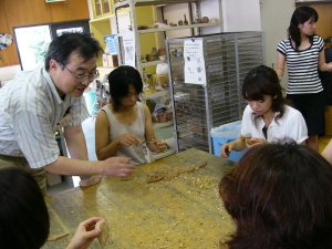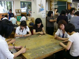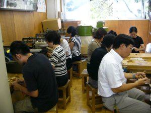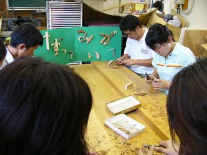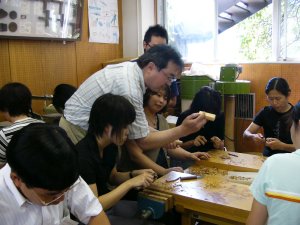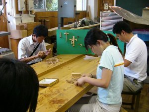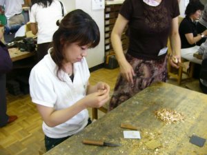 杉などの木材を、小刀で削る。