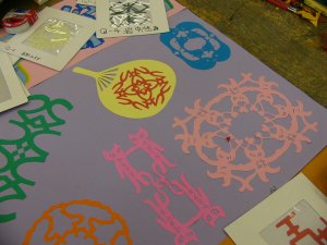| カッターナイフで文字を切り取り、 広げてみると、まるで雪の結晶の ようです。 |
