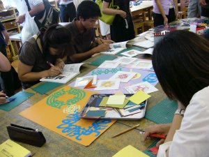 | 薄い紙に貼り付けて、厚紙で額縁をつける と、すてきな作品が完成します。 |