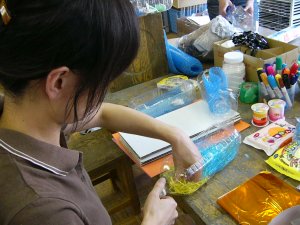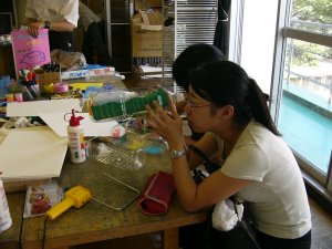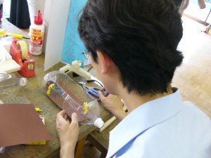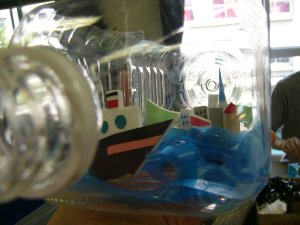 | ペットボトルの側面を切り取ります。 口からのぞいたときの奥行きを考えて 紙や小物などを並べて「夢の風景」を つくります。 |