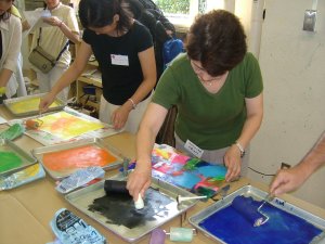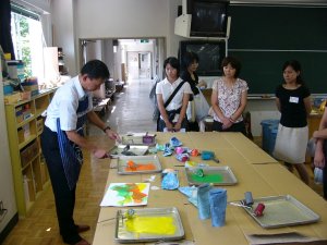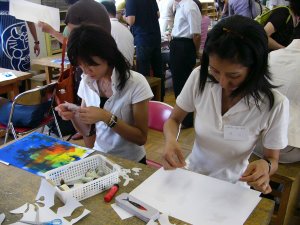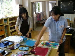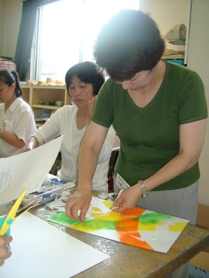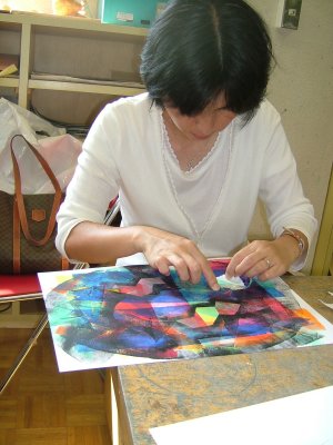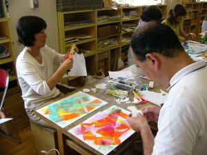 | 表面のしっかりした紙を用意します。 タックシール(はがしやすく加工されている)を 好きな形に切って貼ります。 薄い色からローラーで重ねていきます。 また、タックシールを貼って、違う色をローラー で重ねます。 シールを貼る→ローラー→シール、ろーらー 最後は、黒などの濃い色で覆うと、シールを はがした時の見え方がきれいなようです。 |