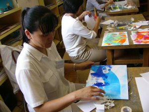 | シールをていねいにはがすと、白だけでなく いろいろな色合いのもようがのこります。 うーん、幻想的な色合いのステンシル作品が できましたね。 |