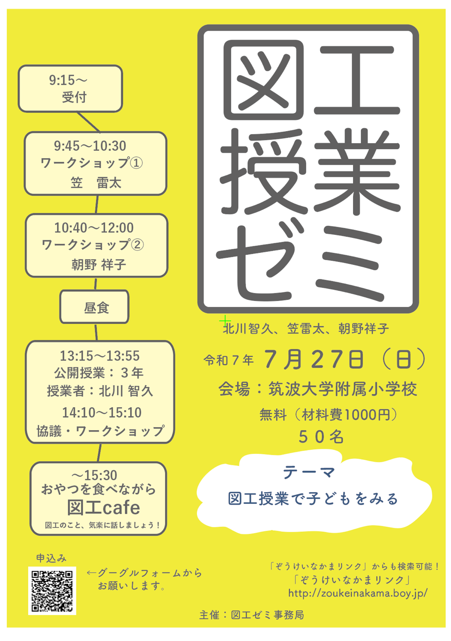 筑波大附属小図工部員3名による研修会 公開授業とワークショップを予定 案内状 お申込み |